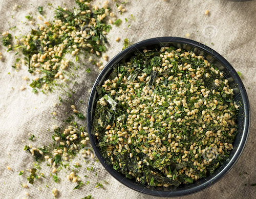 Furikake in Japanese has come to simply mean ‘sprinkle’. It’s most often made with sesame seeds, seaweed and dried fish however there are variations like gomashio that are vegan friendly. It was created in the early 1900s in Japan as a nutritional supplement to add to food to boost calcium levels. These days it’s a mainstay in most Japanese households. It’s a flavouring like salt and pepper but with added nutritional content!